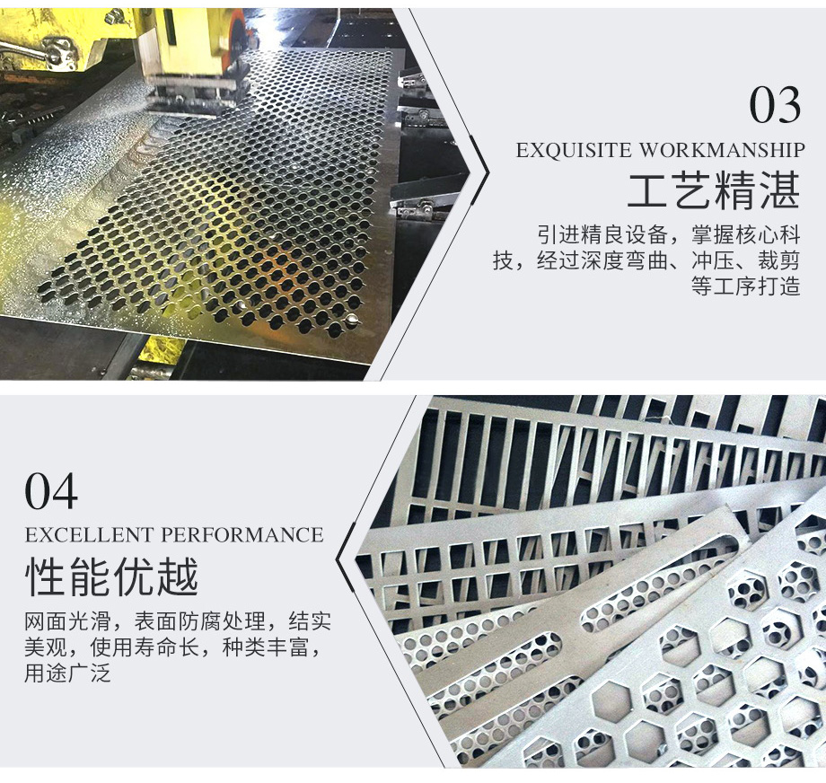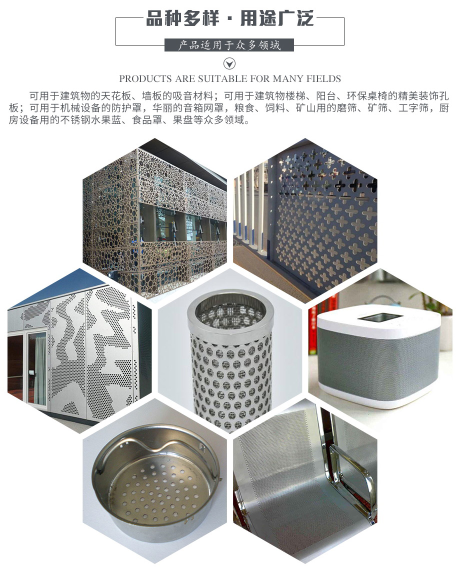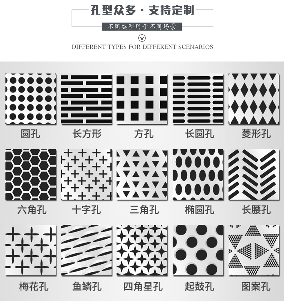 孔型:長方孔、方孔、菱形孔、圓孔、六角形孔、十字孔、三角孔、長圓孔、長腰孔、梅花孔、魚鱗孔、圖案孔、五角星形孔、不規(guī)則孔、起鼓孔等。